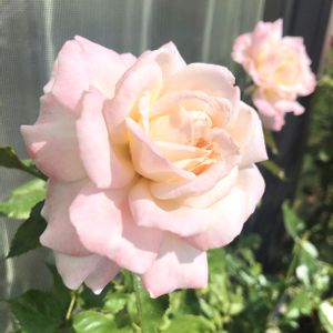 GD(グランデュセス)ルイーズ 大輪の2番花 アプリコット色が入らない、透き通るようなピンク なかなか開かない… 花びらが傷んできてしまった 頑張って!!