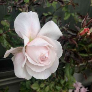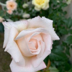 雨に濡れたG.D.ルイーズさん。 今年新苗から育てたのですが、病気にもかからず、樹形も少し横に張る感じですがコンパクト、花もよく咲かしてかつ、香りも素晴らしい!!さらにはトゲも少なめの印象です。花もちは香りが良いので普通かなと。本当に育てやすい品種だと思いました!