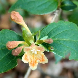 紅花小衝羽根空木(ベニバナコツクバネウツギ) スイカズラ科 ツクバネウツギ属 花期 5〜6月 分布 愛知県、長野県、岐阜県 1つ前の投稿、ツクバネでウツギより少し遅れて咲き始めました。 コツクバネツギの変種です。 萼片が2~3個しかなく、花は黄色〜薄紅色。 裂片の内側全体にオレンジ色の網状模様がある。