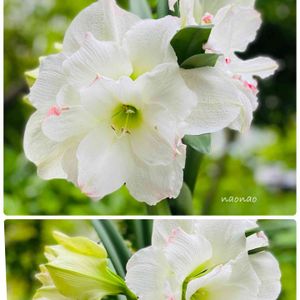 こんにちは☁️ アマリリス キャンディアマデウス 咲きました〜🙌 白い大輪の縁に淡いピンクが入った美しいお花です😍 2月に宅配のお兄さんに「お花好きですか?アマリリスいりませんか?」とまさかの営業され、少しお高めでしたが、なんだか断れず、初めてのアマリリスを育てることに😅 2週間に一度50ccの水やりをする以外は、風通しの良い明るい場所に置いて置くだけで、ただひたすら見守り👀 初めての開花は5月4日。 その後、2つのお花が咲き、全部で3つ大輪のお花を咲かせてくれました。 思った以上に大きくて、可憐で美し〜い💗 買って正解だったかな。 お兄さん、ありがとう😆 上手く管理すれば、来年もまた咲いてくれるようなので、頑張らねば( •̀ᄇ• ́)ﻭ✧