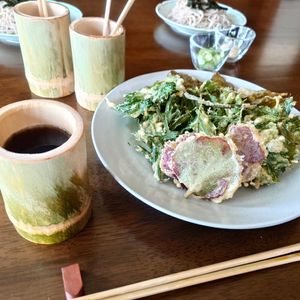 夏の山菜、天ぷらで頂きました 手作り竹の箸と器で夏満喫♬ 雪ノ下 柿の葉 葛の葉 蕨 蕺草 蓬 タラの芽 大葉