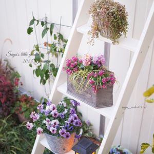 ラダーのDIY🔨 DIYのpicだからpostしなくてもいいかな〜とか思ったんですけども 考えたらGreenSnap様って元々DIYの会社でしたよね?確かテレビで見たような🤔 すみっココーナーに作る予定だった屋根にするはずの木材を上手いこと使えたら…とトンテンカンテンしました🔨 このラダー、違う場所に設置したくて作ってみたんです 設置予定の構造物(すみっココーナーではない別のもの)がまだ影も形もなくて😅とりあえずのここ置き🌼 スペースがない庭なので縦ライン有効活用↑ 撮影時は夕方🌆完成が嬉しくて撮っちゃいました📷