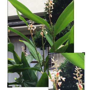 サゲンバナの花と蕾です。 正式名:ゲットウ(月桃) 花が咲いているの初めて見ました。大きな葉は抗菌作用があり、包んで蒸したりします。 奥様は鹿児島出身で持ってきて庭に植えたそうです。今の時期咲くそうです。