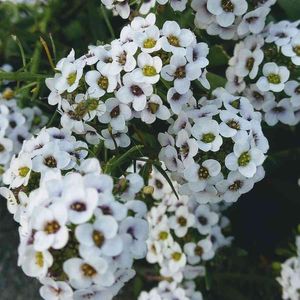 アリッサム 白い小さい花の集まりだけど アップすると薄紫と黄緑❔ 二色なの⁉️ ウン?虫がいるよ 蜜は美味しいんだろうねぇ😆