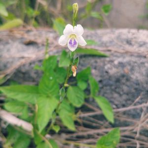 道端にて初めて見る花🌸 多分 アシスタシア・ガンゲティカ(キツネノマゴ科) かな? 白い花に中心が藍紫でかわいい。 除草剤を撒かれる前に連れて帰るべき?