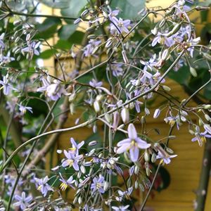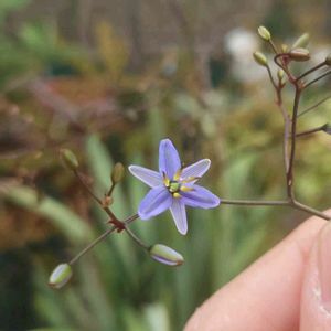 ディアネラ ブルーストリームの花が咲いた。小さくてカワイイ。 グレビレアやユーカリの剪定枝を適当に挿している。屋外放置で発根するかは運次第。