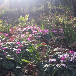 今見返したら、やっぱりこれも投稿したい ‼️高崎市下里美のクリスマスローズガーデン、原種のシクラメン・コウムも日を浴びて可愛いい😍でも1度枯らしてるので、見るだけ〜⁉️