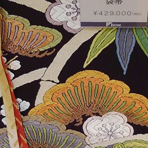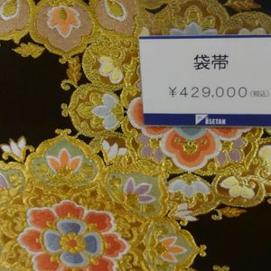 チョコレート色の濃い 茶色の地に金糸が きれいに浮かびあがる 落ち着いた帯でした。 上手に撮れていませんでした。 値段は要らないかな。。