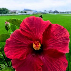 🌺今日の花🌺ハイビスカス🌺 今日は久しぶりに雨☔️ やっと頂けました🥰☔️ 我が家でも咲きました😊🙌 見事な大輪です17センチありました🌺 バックの田んぼよりスケールの大きさ感じるくらいです🌺 私もパッと ひと花咲かせてみたいです😆💕 では今日も遅めのスタートですけど楽しんでいきましょう〜🙋♀️💕 お花の種類名前後でコメント📝追加したいと思います では お仕事 行ってきます🏃♀️🏃♀️🏃♀️ 見て下さってありがとうございます😊