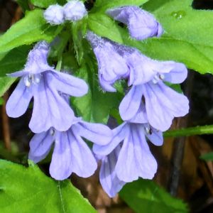 美しい薄紫色のオウギカズラの花が咲いていました♡🌿 日本固有種で多くの地方で準絶滅危惧種に指定されています、山地の木陰の湿った場所を好んで生息しています。 葉は対生し5角状心形で不揃いの浅い切れ込みがあります。 長さ2~5cm幅1.5~4cm位で花に比べて大きな葉です。 基部の節から長く走出枝(ランナー)を出し走出枝に付く葉はやや小型です。 花の上唇は2裂して長さ4mm位 下唇は3裂して開出しています。 雄蕊4本雌蕊1個です。 シソ科キランソウ属