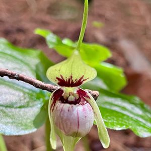 小敦盛草/コアツモリソウ ①③ちょっと失礼して小枝で持ち上げて🫴お顔をアップで撮りましたが ②本当の姿は 葉の下に小さな花が下向きにぶら下がって咲いています ④萼片などあわせて1円玉くらいか?こんな時に限って👛無かったので10円で 小さいながら敦盛草の仲間とわかる花です♡ めんこ〜い😍