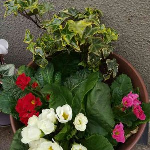 プリムラジュリアン🌺 花色が豊富なので、 選ぶのに大分迷いましたが、 この3色の組み合わせは とても気に入っています😃🎶 今のところ、白が一番よく 咲いています😊 寄せ植えしたアイビーも 元気です🌿