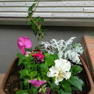 今日は朝から植え替えと 寄せ植え作り🌺 雨🌂が降りだす前に 作業を終えられて よかったです😅 白いフリル咲きの パンジーは、ももこ🌼 その隣り、下を向いてますが よく咲くスミレ💜 左奥の紫色は、 普通のお安いパンジーです😊
