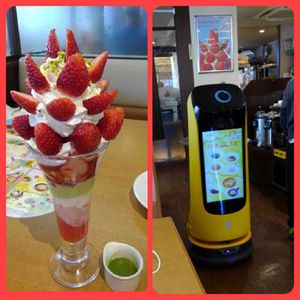 墓参りの後、お昼御飯をココスで食べたのに、写真撮らないで食べちゃって、デザートの≪超いちご🍓15とピスタチオのクイーンパフェ≫を食べました😋😋😋ロボット🤖が運んでくれました😵😍⤴️⤴️ 美味しかったです🤤😋🤤😋