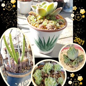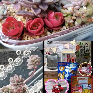 今日2枚目〜 *˙︶˙*)ノ TonyTonyサンで、お正月飾りを 作ってきました〜( *´艸`) 教えてくれたsuzuチャンと合流✨ 入れ物を選び、小物を選び… 多肉チャンは、ハウスの中から、INしたいものを🚶🎶 何にしようか想像しながらも、私は少し木立してるコと、色合いを考えて選んでみました(⋆ᴗ͈ˬᴗ͈)”❤️ 紅日傘をバックにして、 ワ-テルメイエリ-やコルデタを入れてみました( *´艸`) 初めてのコたちで、ちょっとどんな感じになるか不安だったけど… 手前にはピ-チプリデに、ロッティ- 火祭りの光をinしました😋 『迎春』の文字をハッキリ出したかったので、考えながら植えました( *¯ ³¯*) 隙間には、ピアポップに小米星で、飾ってみましたよ(๓´罒`๓)♪♪ どうでしょうか~(*˘︶˘*)♡ これを実家へ持って行って飾ってもらいました(๑˃ᴗ˂)و♡ 今日の朝、突然に友達にLINEして一緒に行くことになり、友達も寄せ植えを楽しみながら出来てて、素敵に完成させていました( *´艸`) もちろん、suzuチャンもとっても可愛く完成させてたので、きっと投稿すると思います❤