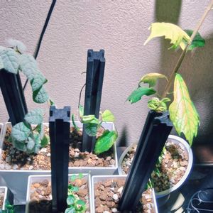 フィカス ベンジャミナ バリエガータ フィカス ベンジャミナ ブラック 割と好きなんですよね、ベンジャミン。カール葉のシタシオンやバロックはもちろん、ノーマルリーフも。 奥の大きい方のベンジャミンは特に商品名表記のなかった斑入り。 ベンジャミンは複数本の株を捻ったり三つ編みにしたりする仕立てが一般的ですが、自然樹形でこのサイズのものは意外と出会えないし、値札間違ってるんじゃないかと思うくらい安かったので購入。 しかし冬越しで寒さと水切れで全枯れしてしまいもうダメかと諦めていましたが春に芽吹き屋外管理でここまで回復しました。 枝の付け根がスカスカですが、かえって風通しが良くていいんじゃないかな? 手前の小さい方は今年購入。斑入り2種と斑なしの計3種が売られていて、特に気になったのがこの斑なしのやつ。 一見ノーマルだけどよくよく見ると葉色がかなり濃い?これは前々からちょっと欲しかったブラックなのでは? 北里さん1枚はかなりお得な気がするけど、捻り仕立てはあんましそそらないな~と気になりながらも保留していたら、店を訪れる度にどんどん葉を落としみすぼらしい姿になっていく。店内売場が暗すぎるのだろう。斑入りの方は大丈夫だけどブラックは耐陰性がかなり低そう。流石に酷い状態なので購入は見送ることに。 ところが普段行かない系列店に立ち寄った時、滅茶苦茶状態良く生長しているブラックが!店内売場は外光が入っていたのでその差だな。ちょうどポイ活で貯めたポイントを換金したところだったのでそれを使ってお迎えしました。