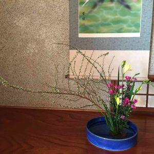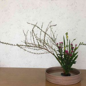 2018年1月29日 今回のお稽古🌼は、未生流の基本形、個性盛花、横斜型。 今回の花材、フリージア、小菊etc.