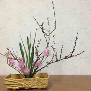 2018年2月16日 今回のお稽古🌼は、未生流の基本形、個性盛花、斜型。 今回の花材、梅、アイリス、スイートピー