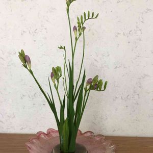 2018年3月9日 今回のお稽古🌼は、未生流の基本形、格花、フリージアの一種いけ。 先生に手取り足取りで、何とかここまで形になりました〜💦 今回の花材、フリージア