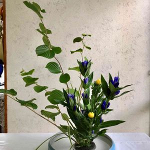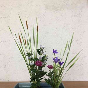 2018年7月7日 今回のお稽古🌼は、未生流の基本形、個性盛花、分離型。 リンドウと桔梗のブルーが涼しげで、スッキリと仕上がりました😊 ちなみに、桔梗は、先生がお庭で丹精込めて育てた桔梗です。 私のお稽古で、しっかり活かされています。 先生、ありがとう❗️ 今回の花材、ガマ、リンドウ、桔梗、菊