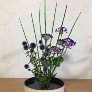 2018年7月21日 今回のお稽古🌼は、未生流の基本形、色彩盛花、放射型。 この何とも言えない涼しげな色合い🎐 そして、ルリダマアザミのボンボンがまた可愛らしい💕 今回の花材、ルリダマアザミ、トルコキキョウ、トクサ