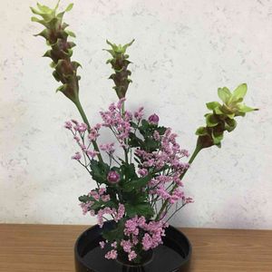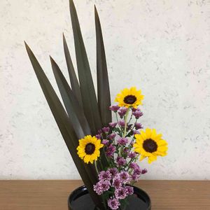 2018年8月11日 今回のお稽古🌼、未生流の基本形、色彩盛花、体用型A。 盛花の基本形でニューサイランときたら、色彩盛花の放射型を当てはめるのか普通なのだが、基本形は基本形でも、この度は、意表をついて、あえての体用型Aにチャレンジ❗️ で、やってみれば、出来るもんだ👍 そして、今回のニューサイランは、紫がかって、渋みがあり、とっても上品でキレイ〜✨✨✨ 今回の花材、ニューサイラン、ヒマワリ、小菊