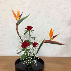 2018年10月1月 今回のお稽古🌼、未生流の基本形、色彩盛花、体用型B。 今回花材、ストレチア、バラ、etc.