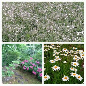 かなり自由な感じの母の庭🌿😄 かすみ草とマーガレット?🌼 左下は帰省通り道🚙によく寄る 森の中の喫茶店☕のお庭です🏞️ 名前はわからないけど とっても綺麗なピンクのお花🌺