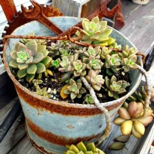 台風7号山口県付近接近中💦 多肉サンたち大丈夫かなー💦 春にリメ缶からサビバケツに植え替えたブロンズ姫 いい感じに成長中 台風でもげませんようにwww