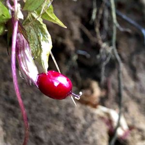 🌱ツルリンドウの実 夏から秋にかけて咲く花は目立たず見つけにくいが、ルビー色の綺麗な実は周りが枯れてしまった冬野の中で良く目立つ。 花冠の上に突き出たように付く液果は小さなリンゴのようで美味しそうに見えるが、この時期まで残っているという事は見た目と違って美味ではないのかもしれない。