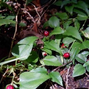 ツルリンドウ リンドウ科 ほかのリンドウの仲間は、乾いたからの小さな種を付けるが、このツルリンドウだけ赤い実をつける。