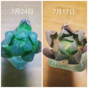 告白します! 多肉1年生で無知な私は かなーり暑くなるまで、ハオちゃんずをお外に放置してました😰💦 水はあげてなかったけど、日焼けで大変なことに😢 すっごい茶色になってしまったオブツーサを、ネットで調べて水耕栽培を試してみました🌱💧 右が使用前(?)左が1週間後です😆 光の具合もあるけど、みるみる緑に☺💕💕💕💕 ライザップもビックリでしょう😆 多肉って凄いなぁ🌱不思議だなぁ😊💕
