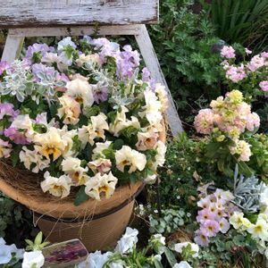 前picのストック寄せ植えの向こう側 寄せ植えの一部でローダンセマム エルフピンク❇️🌿 淡いピンクで優しい花色 夢見るパンジー2色、アリッサム、クローバー、アネモネ 皆ここは涼しくて快適見たいです(´▽`) 軒下から引っ越して来ました🎶