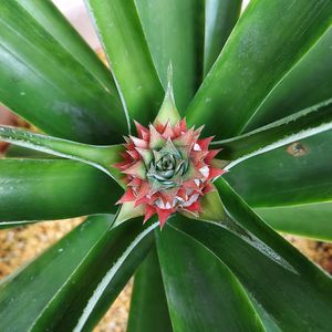 おはようございます 梅雨の貴重な🌞です 『パイナポーの中心から…』 パイナップルの中心から明らかに葉っぱとは違うものが…。 これは、花茎かも! ちょっとワクワクしてきました〰️ 今日も楽しく参りましょう❗