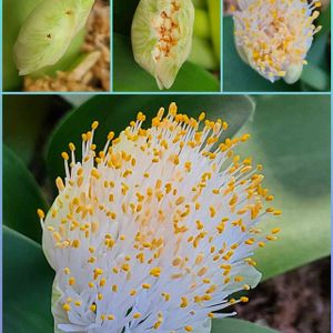 マユハケオモト(眉刷毛万年青) 別名:ハエマンサス 花言葉:「純粋」「清純な心」「富裕」 先が黄色いのが雄しべ 先が裂けているのが雌しべです。