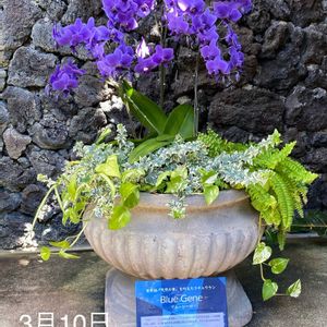 須磨離宮公園温室正面入り口にて💐 世界初「天然の青」を叶えた胡蝶蘭 その名は「ブルージーン」💙 2022年に発売開始、ツユクサ由来の青色遺伝子により実現💙 目玉商品😁?なのでしょう、立派な石壁の前に誇らしく飾られていました🪨 石の日、参加します😊