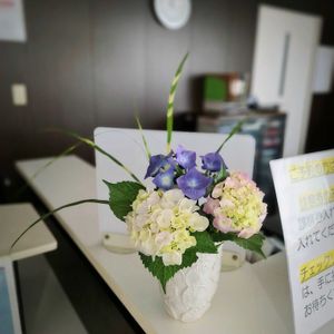 病院の生け花 梅雨らしからぬ連日の猛暑続きで紫陽花もヘトヘト💦💦 エアコンのきいた病院ではとても涼やかなお顔見せてくれてます 今日の外来は紫陽花尽くしです