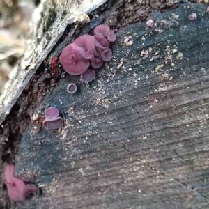紫護謨茸。八ヶ岳を源流とする川俣川渓谷にある風雅な「吐竜(どりゅう)の滝」から、清里の清泉寮に向かう渓流沿いのトレッキングコースで初めて遭遇。一瞬、生き物に見えた。キノコとは思えぬものだが、キノコである。正確には、子嚢(しのう)門ビョウタケ科ムラサキゴムタケ属。 広葉樹の朽ちて多湿な倒木の上に生えるらしく、渓流の近くでは全国どこでも見られるようだ。大きさは1cm程度。薄赤紫色の子嚢盤は、初めは球形、その後、お椀状、皿状、独楽型になり、縁が波打ち、花びら状になることも多いらしい。肉質はゼラチン。触ってみたら、確かにゴム状だった。 食毒はどのサイトも不明とされていて、食用としては適さないようである。ヒメムラサキゴムタケという近縁種があるが、はっきりとは同定できないので、本種とした。紅葉はまだ早かったけれど、ひそやかな珍種発見があったのは、望外の大収穫。