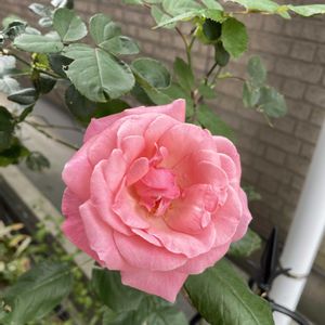 背が高い木立ち性の大きなピンクのバラ🌹 以前の大きな台風で折れても枝がつながっていたら🌸花咲きました🙌 瀕死になりながらも毎年数回咲いてくれる丈夫で長生きな頼もしいバラです。 クイーンエリザベス🌹 で合っていますか?