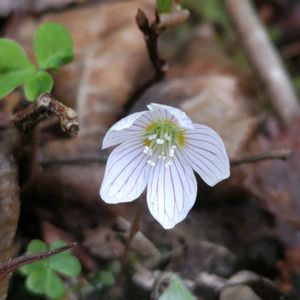 ①②③コミヤマカタバミ…花は白色で紅紫色の細い筋が入り、とっても可憐です♡ 花の中心部には黄斑が入ることもあります。 葉はハート型をした3枚の小葉からなり、小葉は丸みを帯びます。 ④こちらは山形で見てきたミヤマカタバミ、葉の形で違いがわかります。ミヤマカタバミの葉も同じハート型ですが、三角形に近い形をしています。③の葉と比べてみてくださいね☘️ ⑤御射鹿池…秋の紅葉の時期も、今の新緑の季節も素晴らしい✨✨🌳 (横にして見てくださいね♪) 標高1500mにある御射鹿池とおしどり隠しの滝の入口に咲くコミヤマカタバミ 2025.5.28