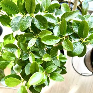お気に入り😊フィカス大好き😘ちっちゃな葉っぱがかわいいフィカスルビキノーサ😊フランスゴムの木🇫🇷 フィカス・ルビギノーサ(Ficus rubiginosa)は、一般的にフランスゴムの木として知られる、オーストラリア原産の観葉植物です。その最大の魅力は、個性的でインテリア性の高い樹形にあります。 【主要な特徴】 • 樹形と幹: 幹がしなやかで弾力性があるため、意図的に曲げられたS字や曲線状の樹形(「フランスゴムの曲」)が多く流通しています。この動きのある幹が、空間にモダンで洗練された印象を与えます。 • 葉の特徴: 葉は小判型で厚みがあり、濃い緑色に強い光沢を持つのが特徴です。一般的なゴムの木に比べると葉が小ぶりで、スッキリとした見た目です。 • 育てやすさ: フィカス属の中でも特に丈夫で育てやすい品種です。比較的高い耐陰性を持つため、明るい室内であれば容易に育てられます。水やりは、春〜秋は土が乾いたらたっぷりと、冬は乾燥気味に管理するのが基本です。 • 花言葉: **「永遠の幸せ」**という縁起の良い花言葉を持ち、新築祝いや開店祝いなどのギフトとしても人気があります。 耐寒性はやや弱いものの(最低5℃〜10℃)、丈夫で管理しやすく、モダンなインテリアに合うため、初心者から愛好家まで広く親しまれている観葉植物です。