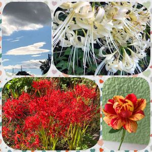 左上 横向きですがハート♥️型の雲 台風はわたしの地域には余り影響はありませんでしたが雨は降り増水した用水路は見かけました🙏🙏被害がありませんように🙏🙏 右上 散歩道で見つけた白い彼岸花 左下 散歩道で見かけた赤い彼岸花 右下 我が家のミニ薔薇 ホーカスポーカス🌹