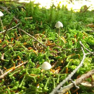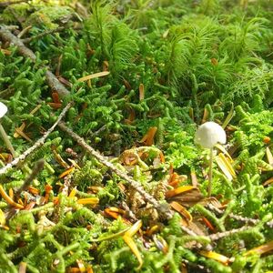 おやおや このキノコはなあに😃 苔のベッドで心地よさそうにしていました。傘の直径は10mmに満たないミニミニです 1枚目 奥秩父 標高2300m