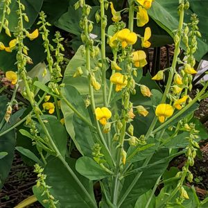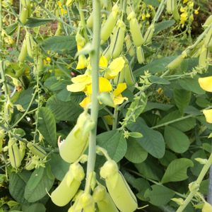 コガネタヌキマメ 黄金狸豆 別名 コヤシタヌキマメ クロタラリア サンヘンプ マメ科 マメ目 タヌキマメ属 タヌキの尻尾を思わせるような太い莢からとか ベビーマラカスとも 幸せの鈴 種がハート型しているのか⁉️ 乾燥した枝や豆殻を振れば鈴の音がすることから、「幸福の鈴」になったとか