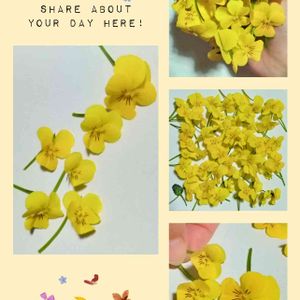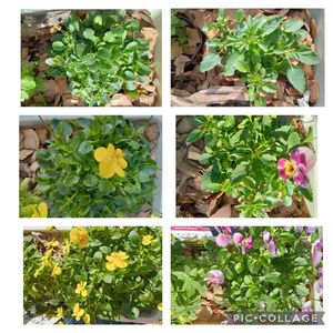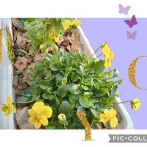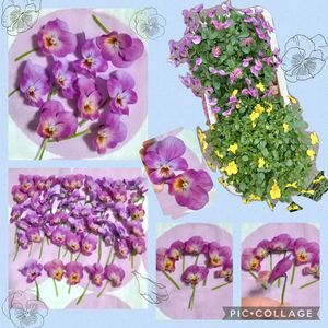左下が数えた50輪のフィオリーナオーロラ🌼 左上は、丸い刺繍枠のイメージ🎵縫えたら素敵💞 右上、ゴールドはまた咲きだして、宿根バーベナがあった形跡の無いくらいすぐに広がりました。元々窮屈ではあった🌵 右下はアイーン型、ゾウさんビオラ型の子たち。 真ん中は、少し色合いが違う子たち。 寒波で傷む前に遊んでみました。今日も寒し🗿