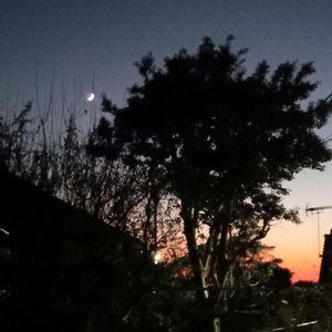 家の庭の 大きなクロガネモチの木と 日没後の夕焼けと そして 細い月 やっと帰ってきた