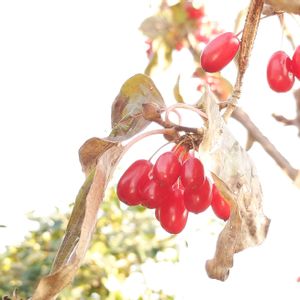 ①②③山茱萸(さんしゅゆ 別名 秋珊瑚(あきさんご) ヤマグミ ミズキ科 落葉広葉樹 果実は直径1~2cm 扁平球 ④⑤冬青(そよご) 別名 フクラシバ モチノキ科 雌雄異株 秋になると直径5mm 果実はさくらんぼ🍒の ように ぶら下がる