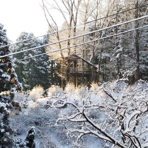 お向かいの花山のツリーハウス 我が家の二階からパチリ ちょっとズームしました✨ ツリーハウスだけが 朝日🌅に照らされてました✨ きれ~でした😃
