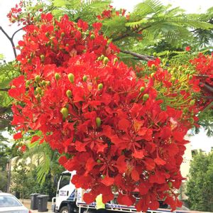 火炎木が満開へと開き始めました。 並木道はレッドカーペットです これは我が家のユニットの一本