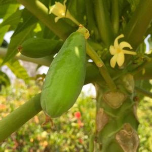 オスだったはずのパパイヤに実が成ってました!😳 このパパイヤは知人の家のこぼれ種で芽吹いたものを本葉が2枚出た状態でもらって来て、種から数えて今年3年目で、背丈はまだ150センチほどです。 我が家に来た翌年から花が沢山咲き始めましたが、残念ながらオスで、実は成りませんでした。 「木の上部を大胆に切り落とすとメスになる」と聞きましたがまだ小さな木の状態ではなんだか可哀想な気がしてそのままになっていましたが、今年は雨が極端に少なく、庭もカラカラなのでパパイヤも危機感を覚え、子孫を残そうと自らメスになったのでしょうか…? 写真では大きく見えますがまだ長さ3cmほどの赤ちゃんです。 成長を楽しみに待ちたいと思います。